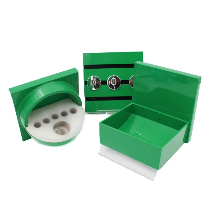 Badrumsinredning med från 70-talet i plast. Tandborstkopp, hängare och toalettrullshållare i plast. Cirka 15 x 15 cm styck. Säljes tillsammans.