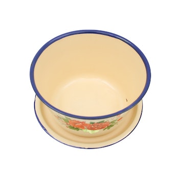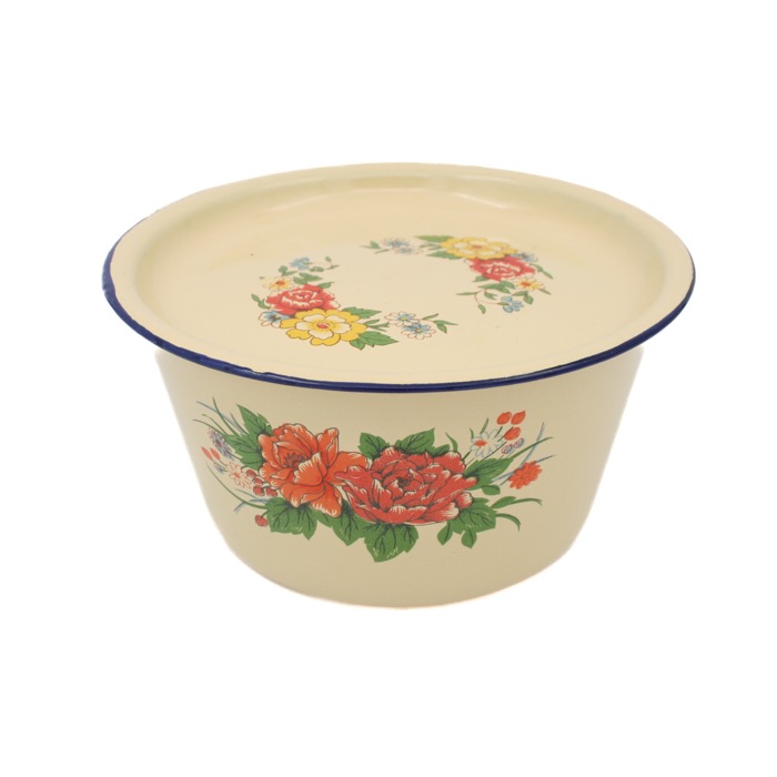 Oerhört vacker burk med lock i emalj i blommor. 18 cm i diameter 9 cm hög. Locket ligger på som en tallrik men sluter inte tätt. Lite spår av tiden.