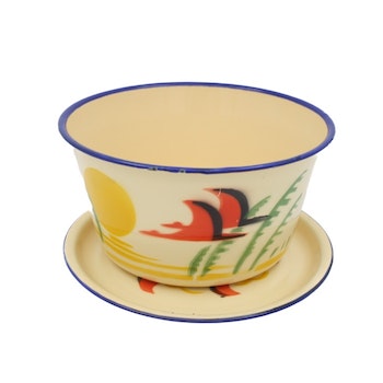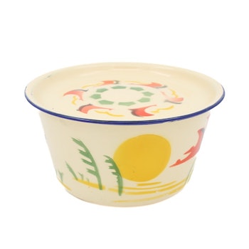 Oerhört vacker burk med lock i emalj i blommor. 19 cm i diameter 10 cm hög. Locket ligger på som en tallrik men sluter inte tätt. Lite spår av tiden.