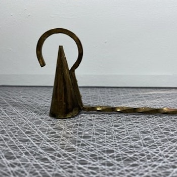 Stor, vacker och snurrad ljussläckare i mässing med hängen så den kan hängas upp. Vi har en exakt likadan här hemma och den är otroligt praktisk. Hela 35 cm lång.