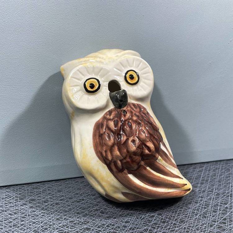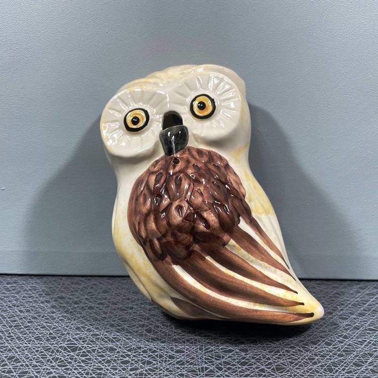 Fin snörhållare i form av en uggla. Snöret läggs i på baksidan och löper ut genom näbben. Ugglan hängs sedan på väggen. 18cm hög och 11cm bred.